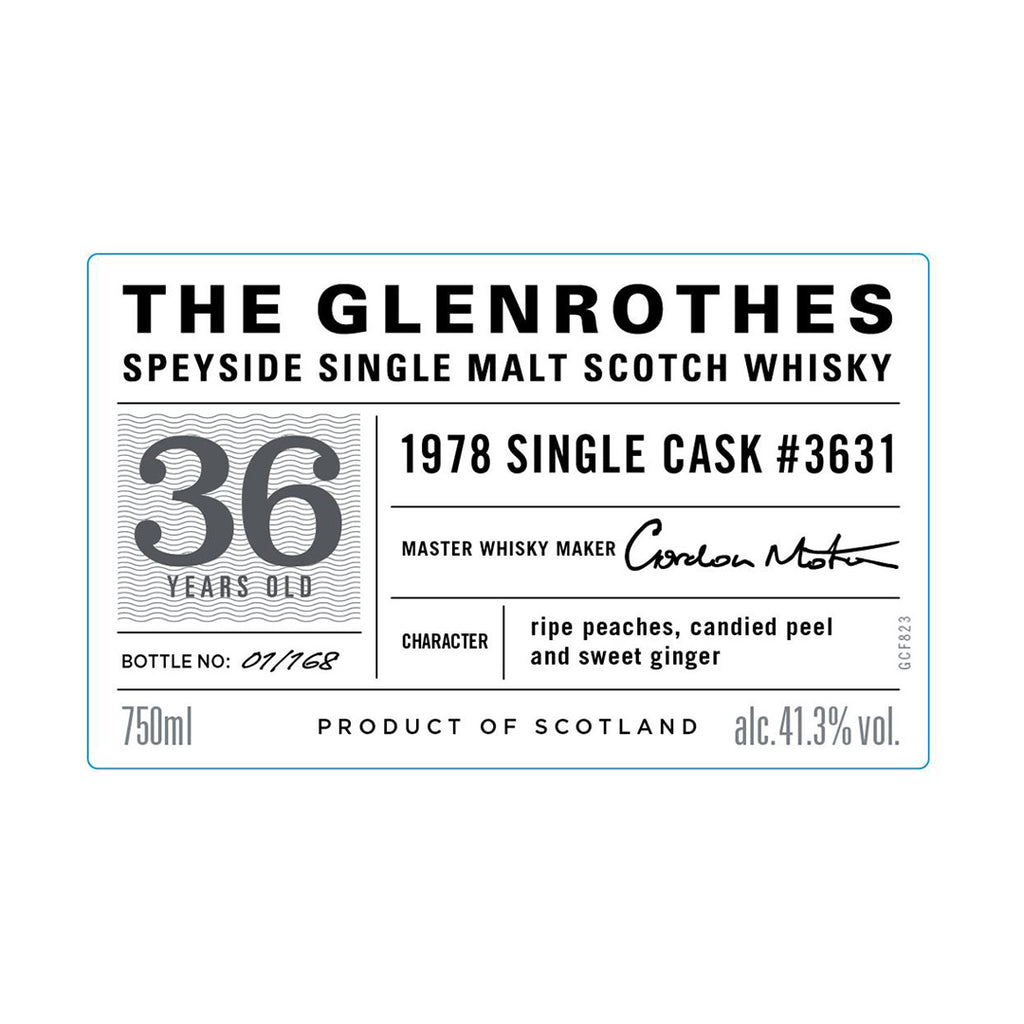 The Glenrothes 36 Year Old 1978 Single Cask #3631 - The Glenrothes 36 Year Old 1978 Single Cask #3631 has a unique character of ripe peaches, candied peel and sweet ginger. The Glenrothes is a Speyside single malt Scotch whisky. Quietly and without fanfare, The Glenrothes has been producing some of Speyside's finest single malt scotch whisky for more than a century.