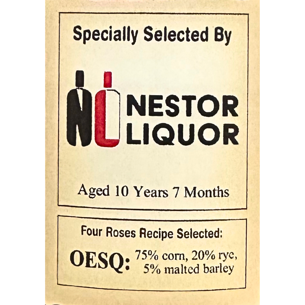 Experience the exceptional craftsmanship of Four Roses with their Private Select OESQ 'Nestor Liquor' edition, a remarkable bourbon boasting a 115.8 proof. This exclusive release, aged for 10 years and 7 months, is a testament to the art of fine whiskey-making, offering a unique and rich tasting experience for bourbon enthusiasts.