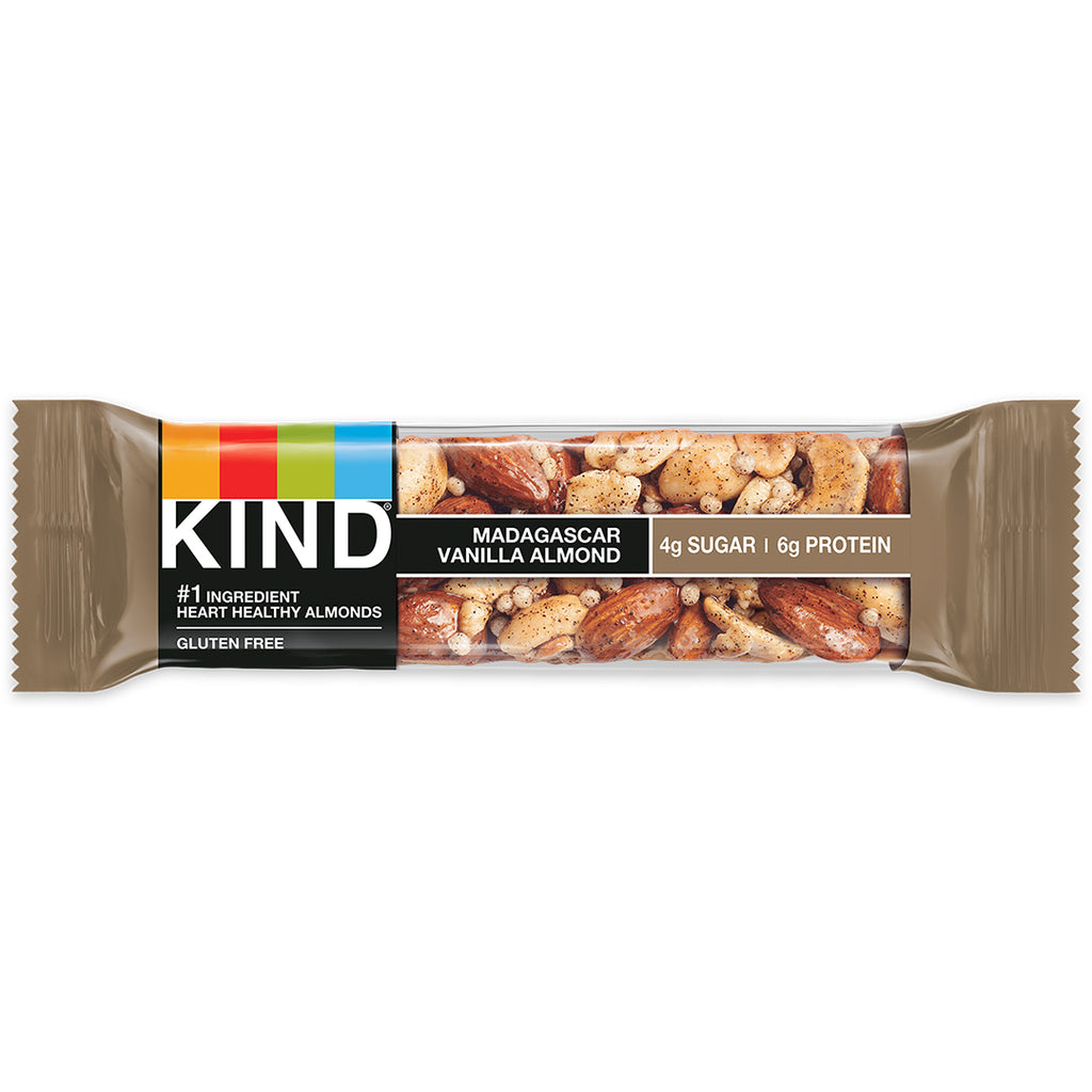 Kind Madagascar Vanilla Almond 1.4 Oz Bar - The island of Madagascar is the only place where you can find the spicy and seductive taste of Madagascar Vanilla. This nut-packed bar is loaded with a sweet and nutty flavor and contains 4g of sugar per bar.