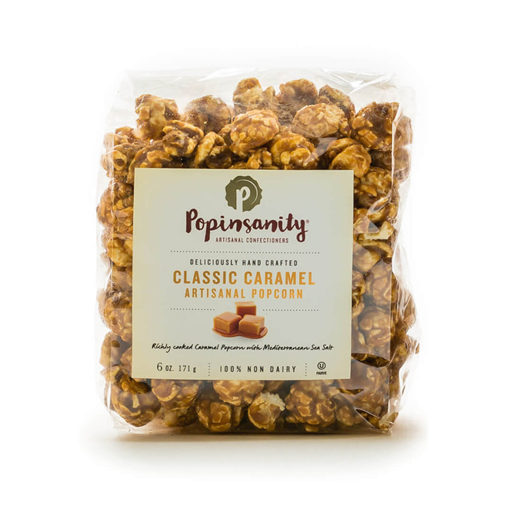 Popinsanity Classic Caramel Fancy Popcorn | Kosher Non Dairy 6Oz Bag - A decadent take on a true classic, this is a flavor that is sure to please. Our luxuriously deluxe popcorn is coated with a sophisticated blend of our finest deep caramel and sprinkled with Mediterranean sea salt for the perfect finishing touch.
