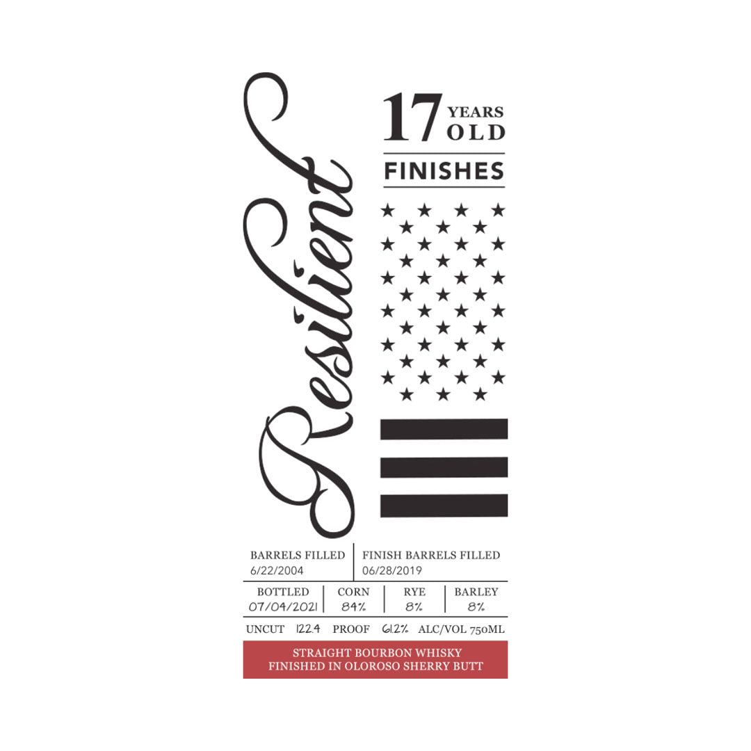 Resilient 17 Year Old Oloroso Sherry Butt Finished Straight Bourbon - Resilient 17 Year Old Oloroso Sherry Butt Finished Straight Bourbon is bottled uncut at 122.4 proof, 61.2% ABV, with a mashbill of 84% corn, 8% rye and 8% barley. Resilient straight bourbon whisky barrels are hand-picked single barrels of quality.