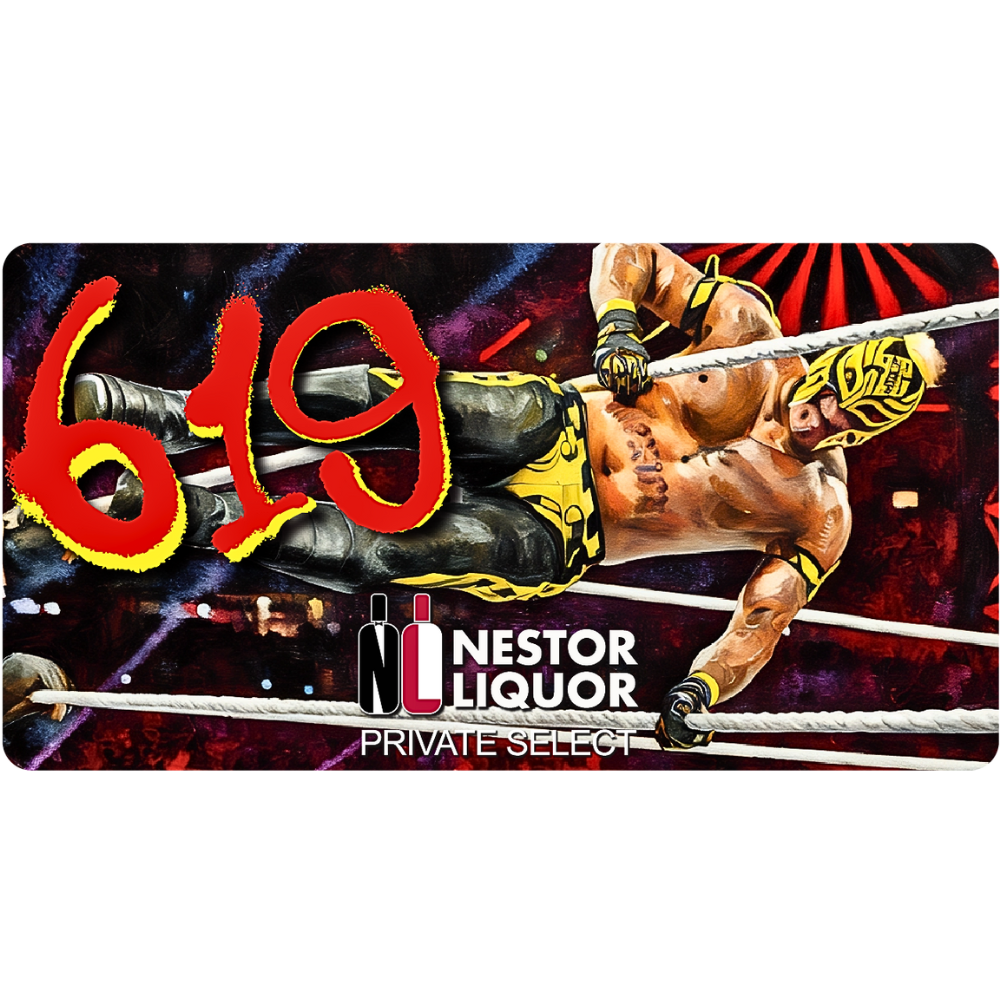 Introducing the Smoke Wagon 7-Year Bourbon Private Select '619', an exclusive single-barrel, high-rye bourbon crafted with precision and bottled for Nestor Liquor. Featuring a mash bill with 39% rye, this bold expression balances spice with rich sweetness. Enhanced by a distinctive Rey Mysterio '619' signature move sticker, this limited-edition release is both a collector’s item and a whiskey aficionado’s dream.
