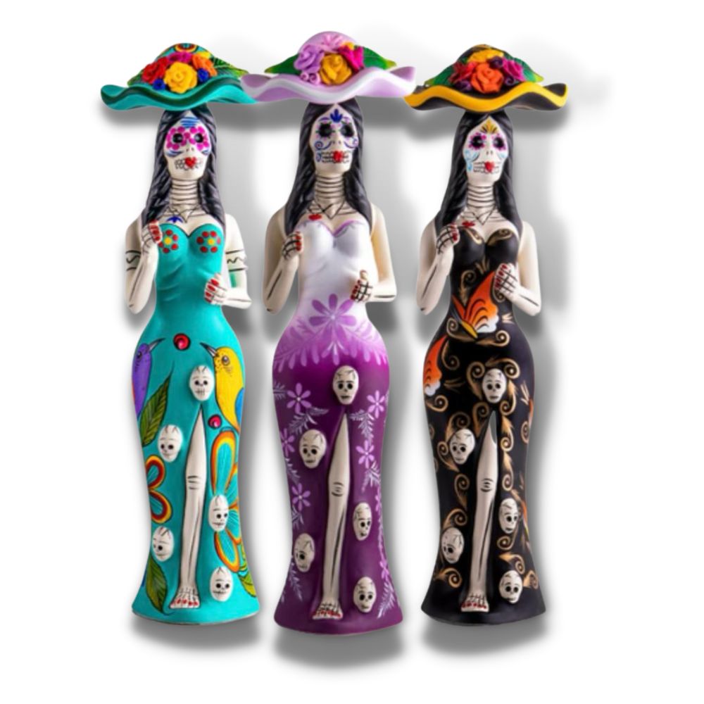 Tequila Epifania Azul Añejo is a handcrafted 100% agave tequila, aged to perfection for a rich and smooth flavor. Each bottle is a unique piece of art, meticulously hand-painted to embody the vibrant spirit of Mexican culture. The distinctive Catrina-shaped ceramic bottles can take up to three days to complete, making each one a collector's item.