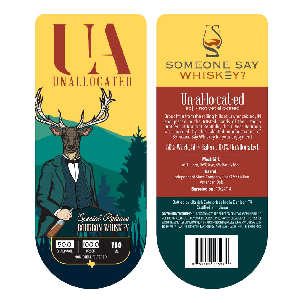 Unallocated Special Release Bourbon - Brought in from the rolling hills of Lawrenceburg, IN and placed in the trusted hands of the Likarish Brothers at Ironroot Republic, this 6 year Bourbon was married by the talented Administrators of Someone Say Whiskey for your enjoyment.